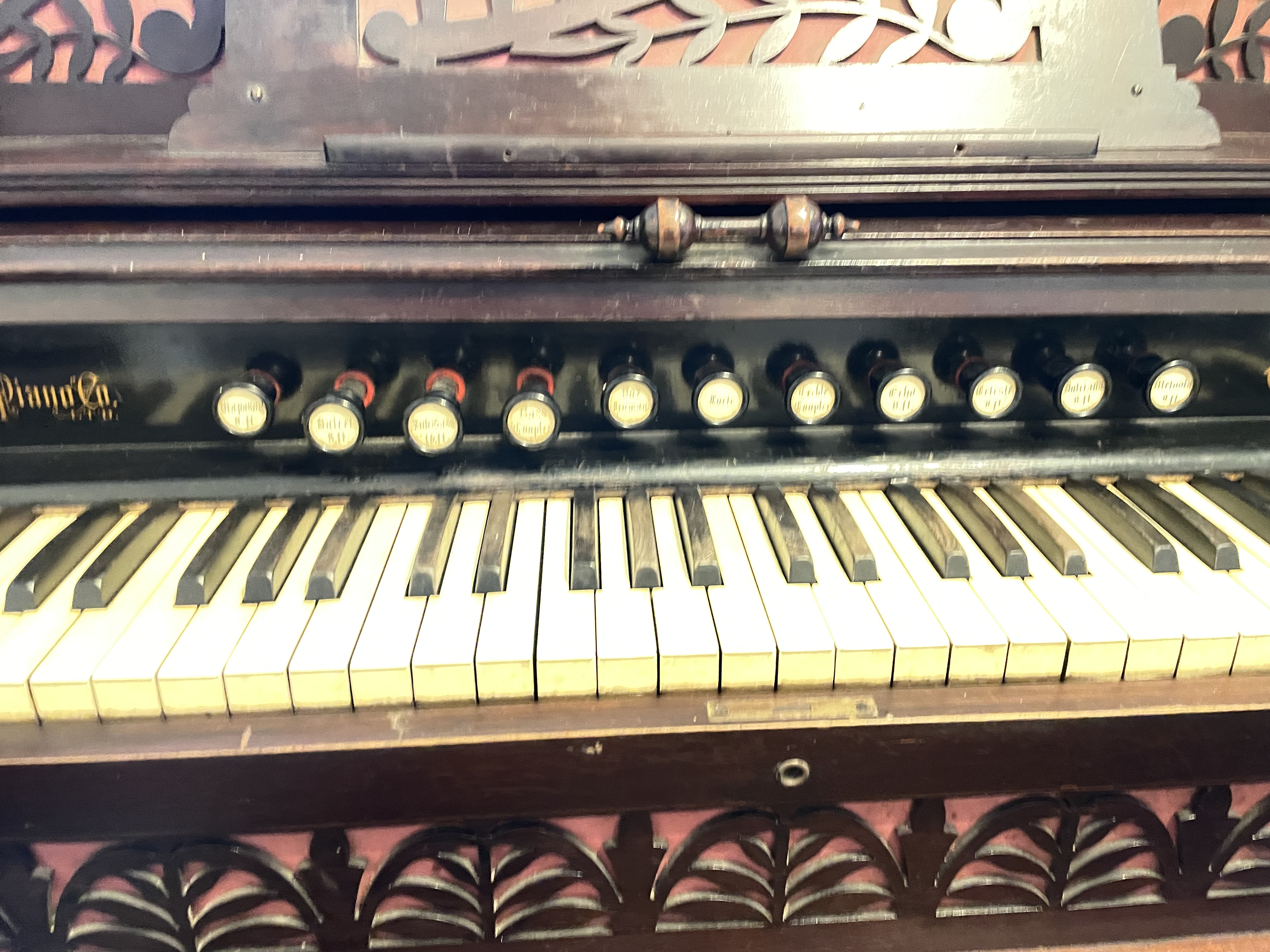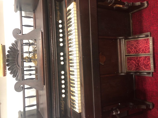 All in playing condition, 13 stops: Principal, Dulciana, Diapason, Dulcet, Bass Coupler, Diapason Forte, Vox Humana, Flute Forte, Treble Coupler, Echo Horn, Melodia, Cello, Forte.